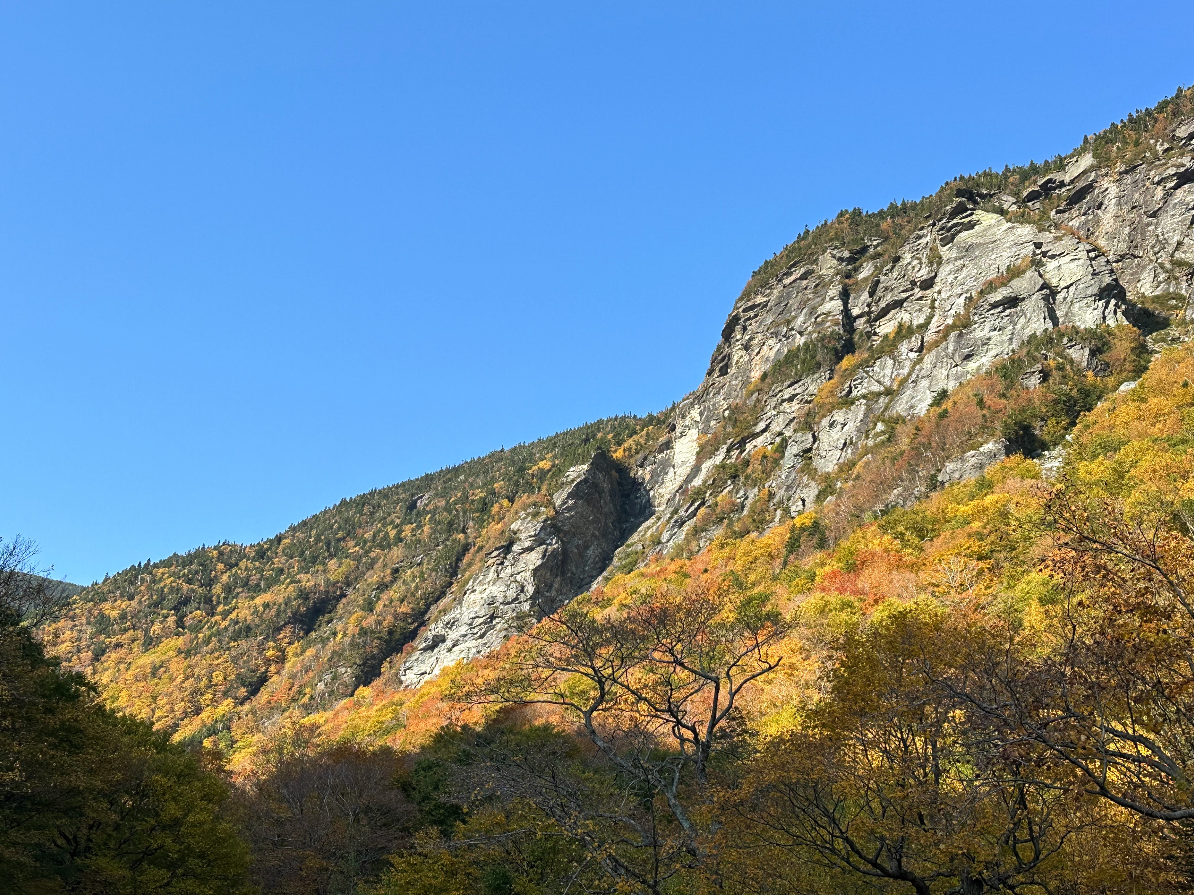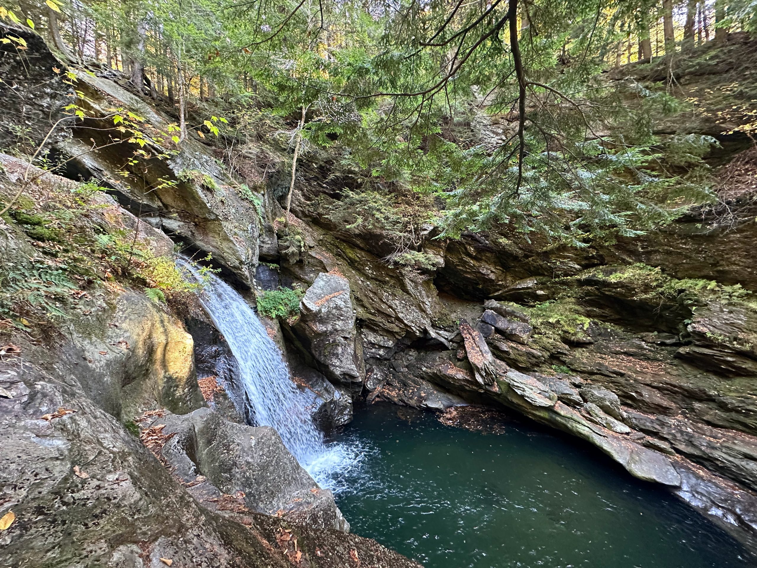 - Smuggler’s Notch Scenic Drive: This is a scenic but narrow mountain road, with a test turn at the start so you can make sure your vehicle can handle it. We didn’t have any issues and were glad we went. While the drive doesn’t offer huge overlook views, it’s unique to pass between steep cliffs and large boulders, with chances to scramble a bit and see the foliage up close. Bingham Falls, near the start of the drive, is also worth a stop and is about a 10-minute walk from the parking lot.
