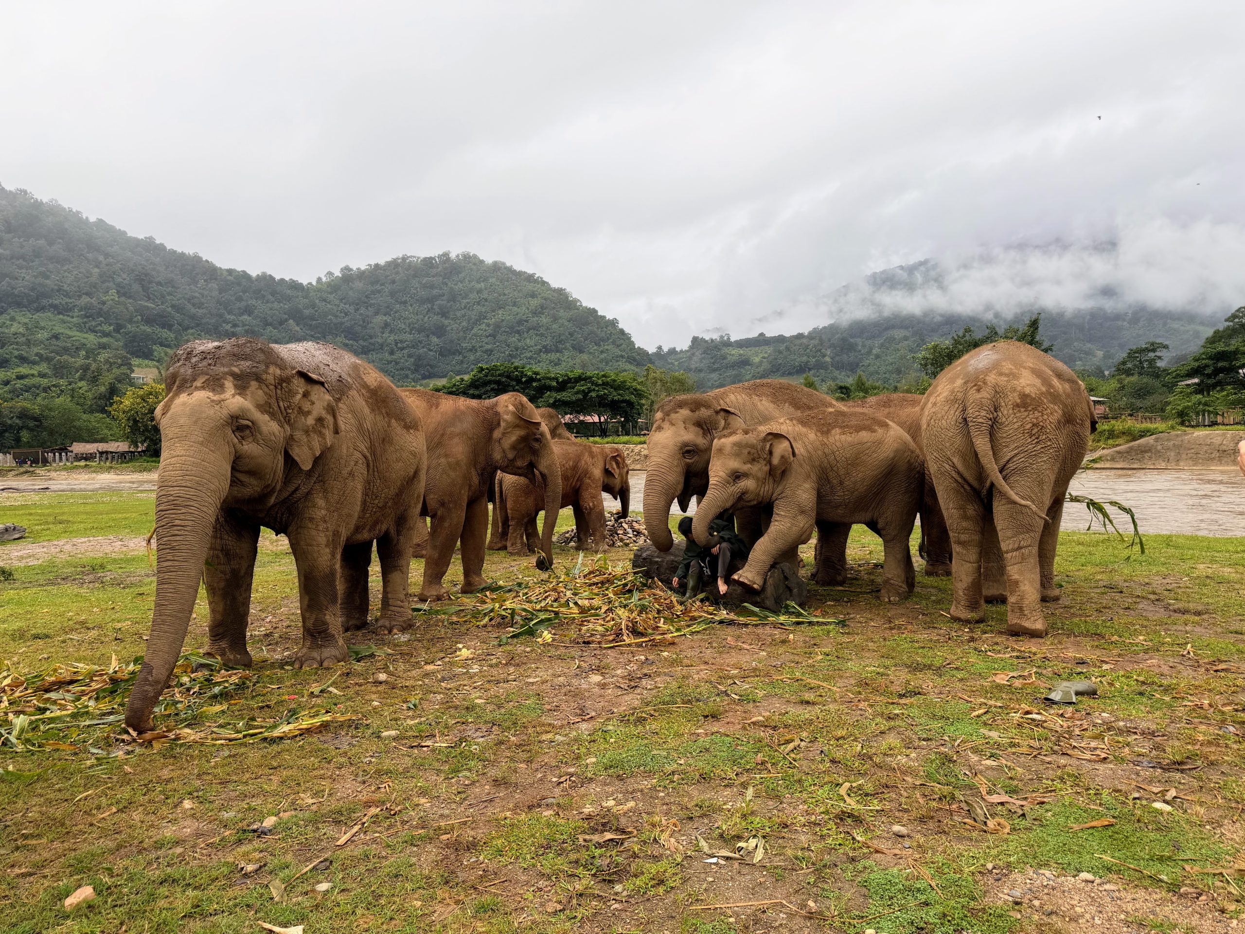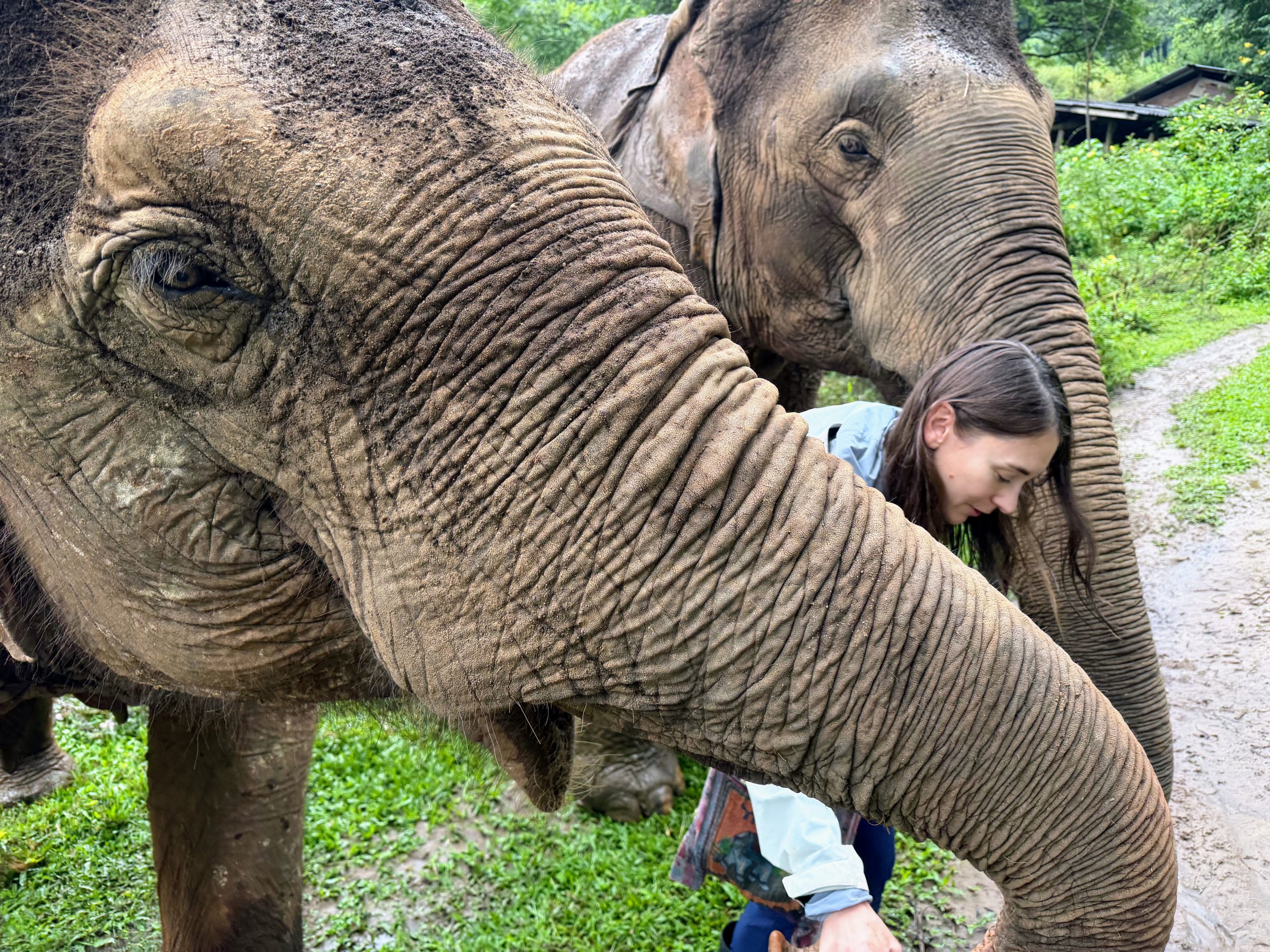 In the afternoon, we headed by van to the main Elephant Nature Park. While the experience was very different from the intimate setting of the farm, it still felt deeply ethical and moving. Instead of three elephants, there were many more, most staying close to their family groups and spending time within their packs. Many of their rescue stories are heartbreaking—these sanctuaries exist because elephants need saving in the first place, often after enduring the brutal “breaking spirit” process used in logging and riding industries. Still, witnessing the bond between the elephants and the park’s founder was incredibly powerful. At one point, about ten elephants gathered around her as she sat on a log singing, with one repeatedly reaching out to wrap her in its trunk.