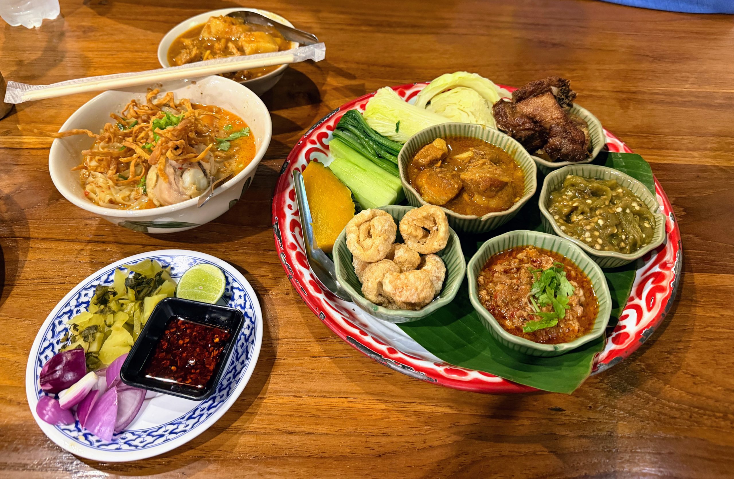 - Huen Muan Jai: This Michelin Bib Gourmand Northern Thai restaurant was one of our favorites in Chiang Mai—and easily the best value. It has a strong reputation (well deserved), which means waits can be long; we waited about 35 minutes for a table. Once seated, though, the food came out quickly. We ordered a full spread to share among the four of us, and everything was excellent. Standout dishes included the Khao Soi Gai, Khai Jeaw Moo Sub, Gaeng Hung Lay, and Ka Prao Moo – Khai Dao Rad Khao. Most dishes leaned spicy, so keep that in mind when ordering.