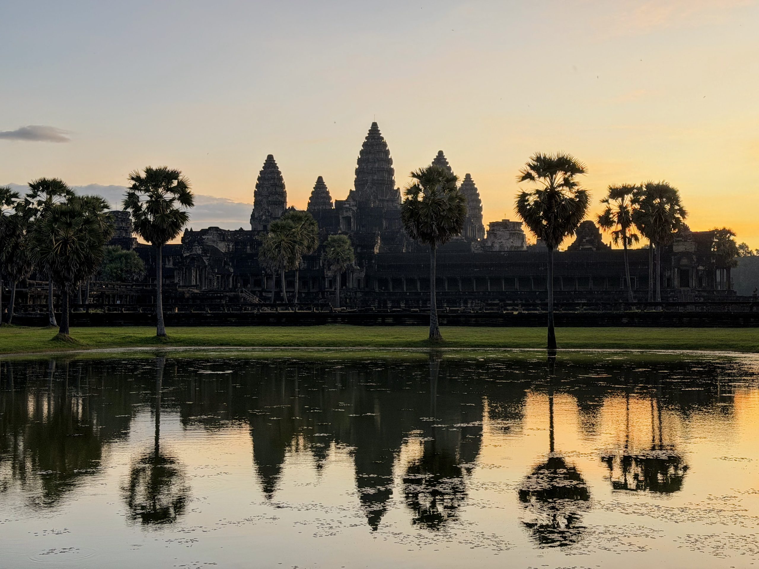 - Angkor Wat: The crown jewel of the complex, Angkor Wat is as iconic as it gets – and also the most crowded, for good reason. The classic experience is arriving before sunrise to watch the sky light up behind the temple, with its reflection shimmering in the ponds out front. It’s beautiful, but also very much a shared experience with thousands of other tourists. Once the sun comes up, you’ll move through the complex with the crowds, learning about its history, admiring the intricate carvings, and taking more photos than you planned. One tip we heard (but didn’t follow) was to catch sunrise here, then immediately leave to visit other temples and return later in the morning once the crowds thin out. In hindsight, that probably would’ve been the move – but it does require some coordination with your guide.