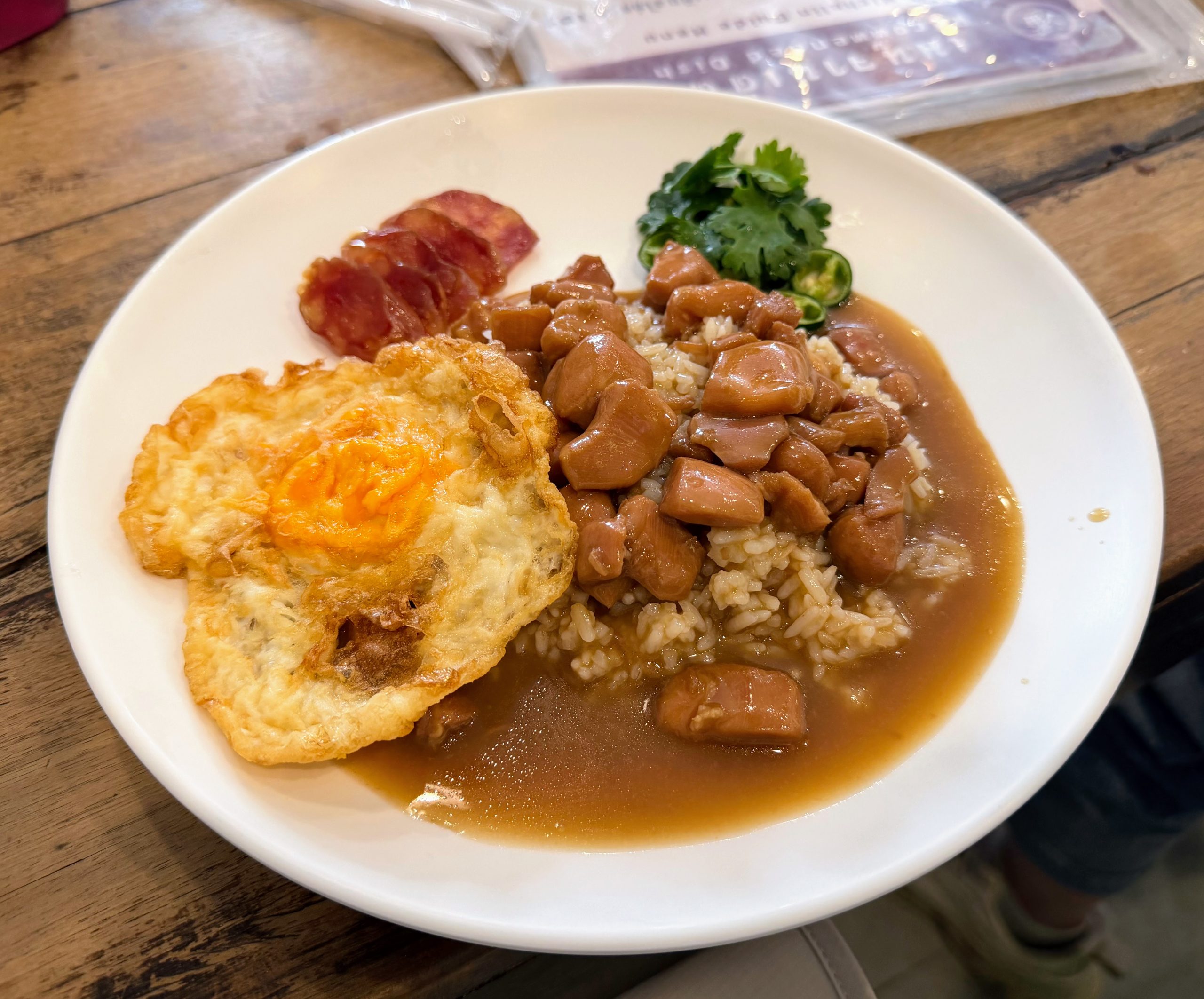 - Sae Phun: Sae Phun is a former Bib Gourmand restaurant, and we’re not entirely sure why it lost the designation – it still checks all the boxes for great food at great prices. The setting is casual with an indoor-outdoor feel, but you’re seated and served. We especially liked the Chicken Stew with Rice, Chicken Sausage, and Fried Egg, as well as the Egg Noodles with “Three Musketeers.”