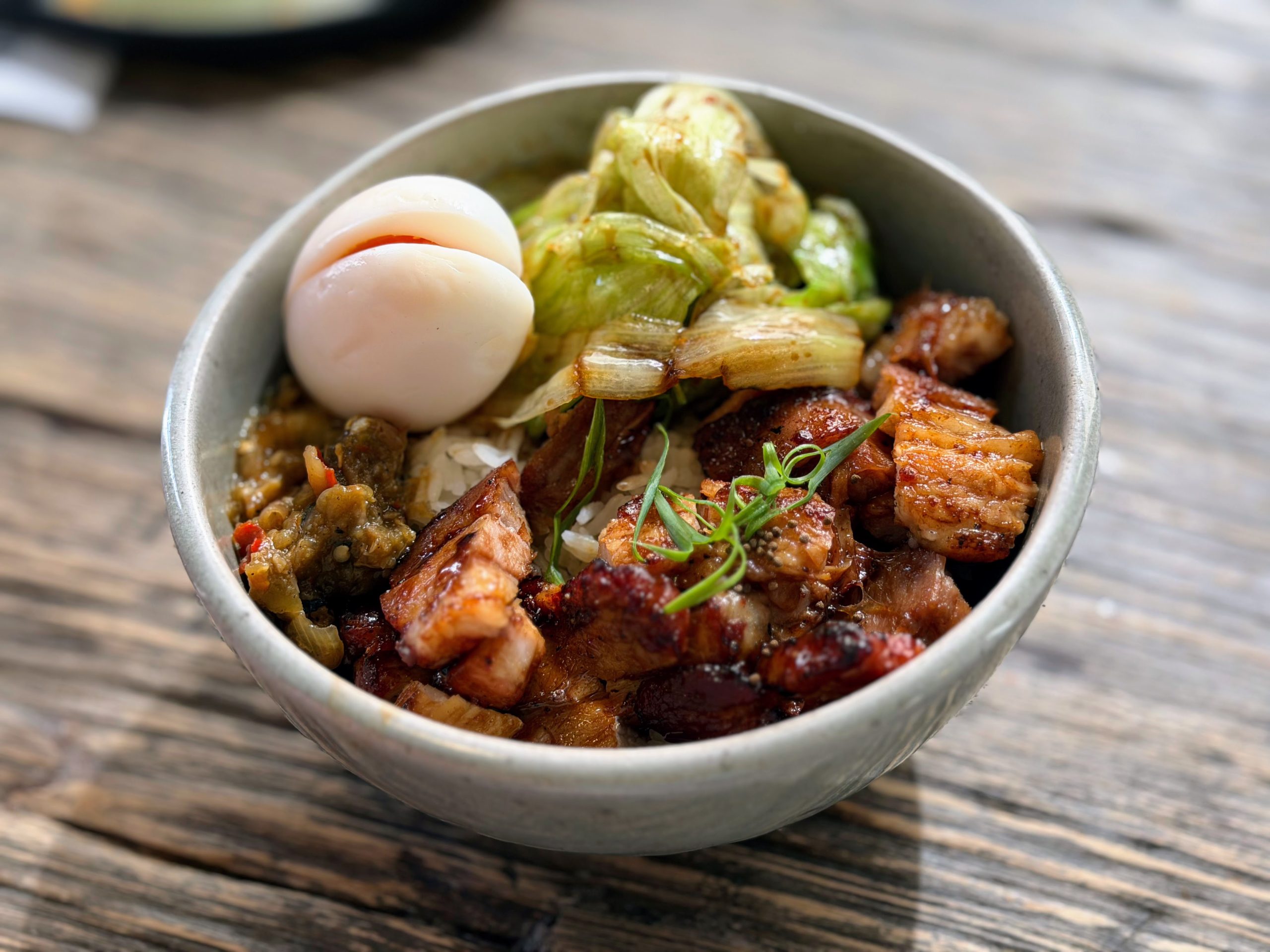 - Aunglo by Yangrak: Aunglo by Yangrak is a Bib Gourmand izakaya-style spot that ended up being one of our favorite meals in the city. The atmosphere is modern and lively, and we liked the ability to order dishes as we went (even if it got a bit smoky from the grilling). Standouts were the Moo Ping and the Chinese-style BBQ pork bowl.